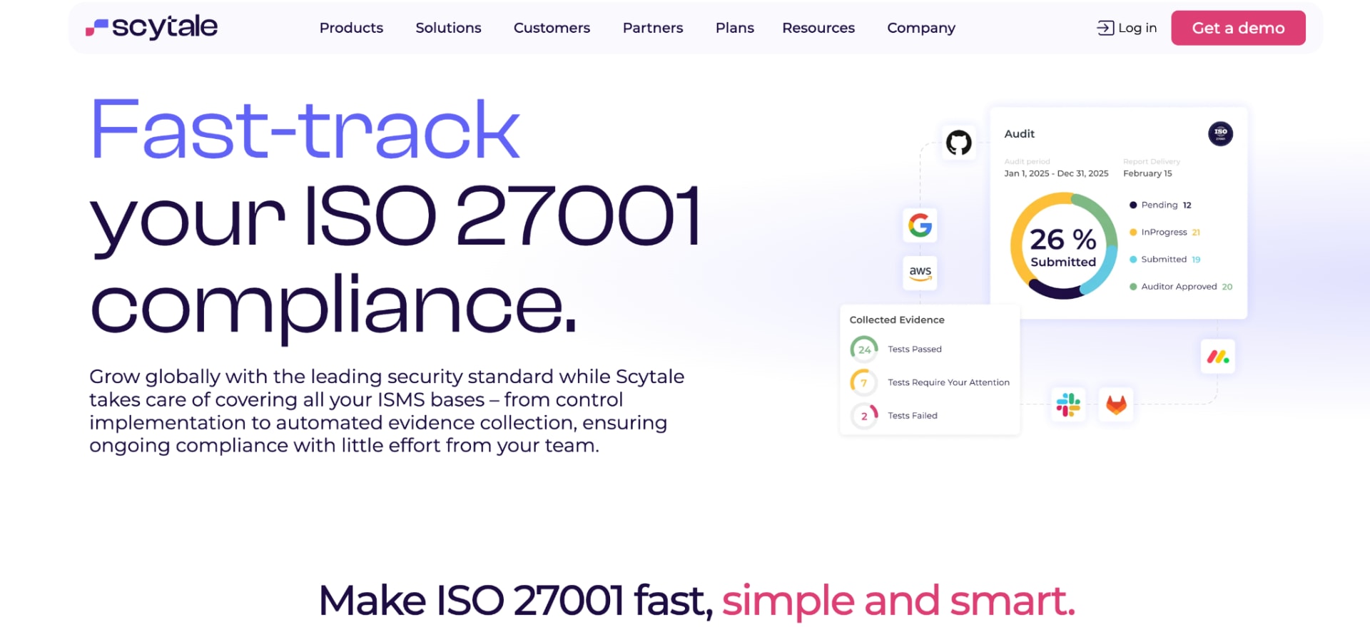 Scytale helps organizations accelerate ISO 27001 certification by up to 90% through a combination of AI-powered compliance automation and tailored guidance from dedicated GRC experts. While other platforms give you software and wish you luck, Scytale assigns you a named compliance expert who holds regular check-ins, customizes your policies, supports audit coordination, and keeps compliance requirements on track.