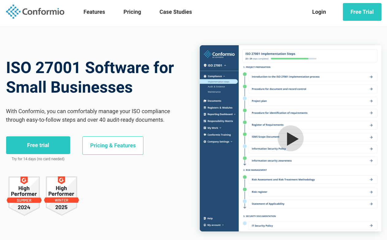 Conformio is one of the few ISO 27001 platforms with transparent pricing. The platform provides ready-to-use templates and automated task management that help small organizations get started without enterprise budgets.