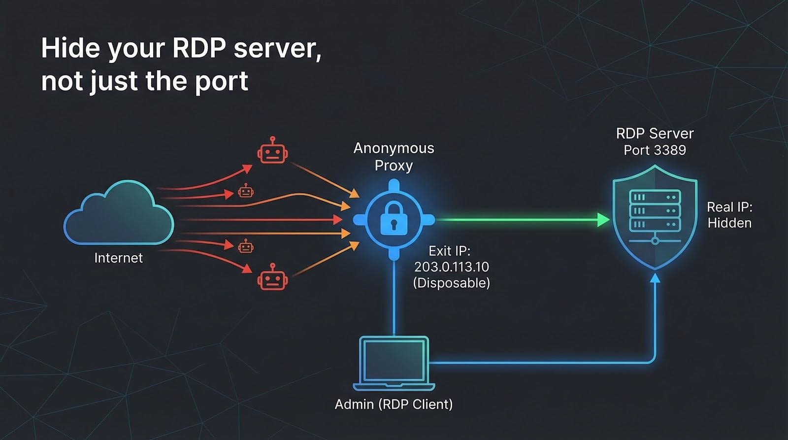 The fix isn’t another lock; it’s hiding the door. Route RDP through an anonymous proxy so attackers see only a disposable exit IP.