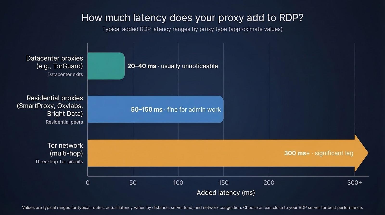 Every middle hop adds latency, but the amount depends on the network you choose. Datacenter exits such as TorGuard typically add 20–40 ms; most users never notice. Residential peers (SmartProxy, Oxylabs, Bright Data) can add 50–150 ms, still fine for admin work. Tor’s three-hop chain is the outlier, often pushing round-trip times past 300 ms. Pick an exit close to the RDP server and enable UDP support whenever the provider offers it.