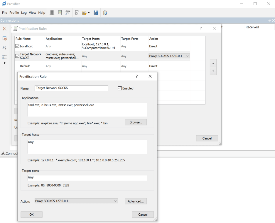 - Create a rule that targets mstsc.exe (or your third-party RDP client) and tunnels it through the proxy.
