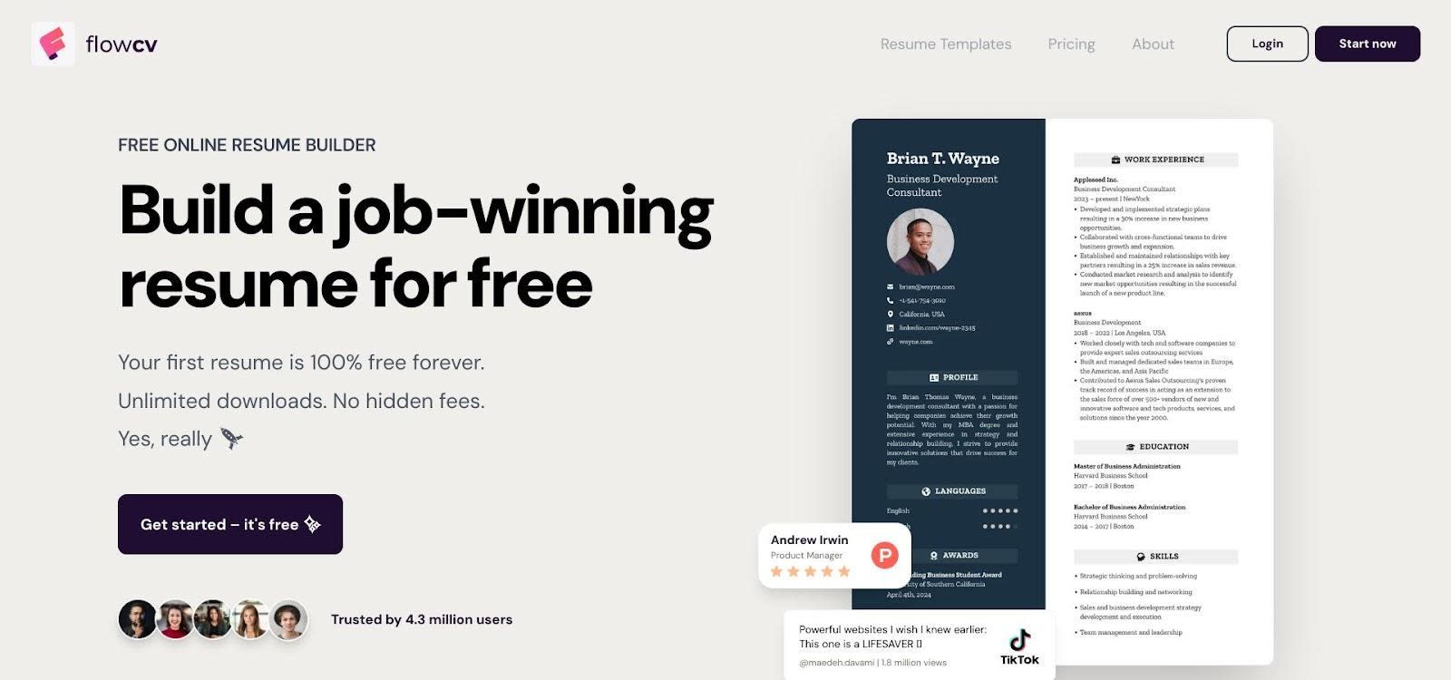 Core features remain free forever. A low-cost Pro plan adds extra layouts, while the baseline offers unlimited downloads without watermarks. For students who value speed, privacy, and control, FlowCV meets all three in one click.