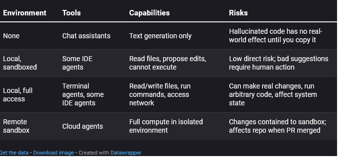 This axis matters for risk assessment. A tool that cannot execute anything can only waste your time with bad suggestions. A tool with shell access can rm -rf if things go wrong. (Good tools prevent this. Not all tools are good tools.) A remote sandbox isolates damage but means you review output without having watched execution.