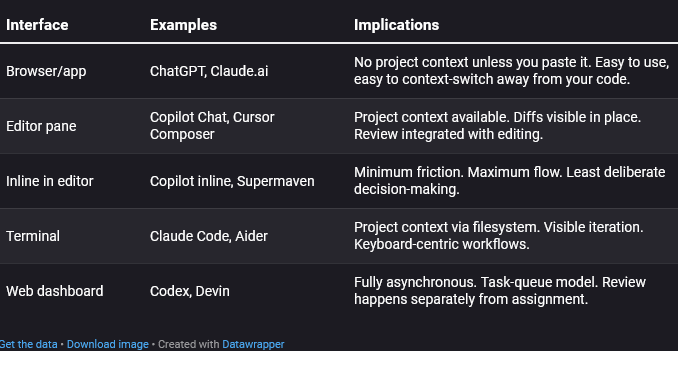 Interface shapes behavior. A tool you access in a browser tab encourages copy-paste workflows. A tool in your terminal encourages watching it work. A tool in a dashboard encourages fire-and-forget. None of these are inherently better; they fit different work styles and different tasks.