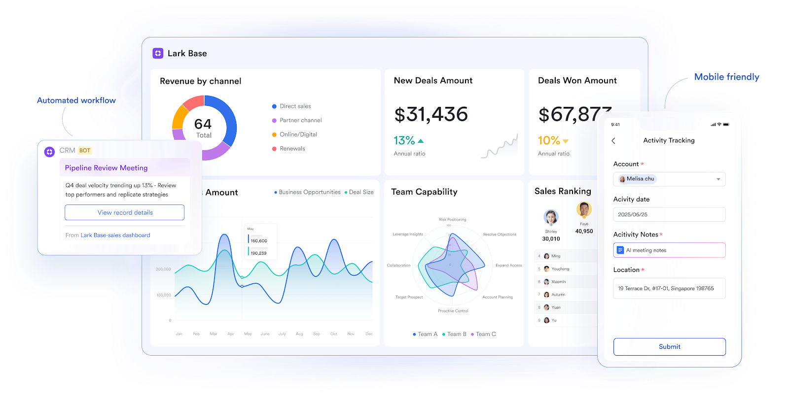 Lark Base gives teams a better option. With View, you can turn the data into a Grid view, a Kanban view,or a Calendar view, easily noticing the dynamics and momentum. Automations handle routine updates like changing task statuses. And because it’s part of Lark, the data connects directly with chats, docs, and forms.